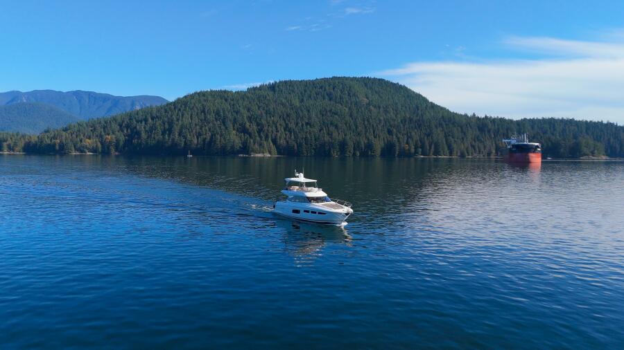 Powered by twin Cummins QSC 8.3 (600HP) engines paired with Zeus pod drives, this yacht delivers a stable, smooth ride with responsive handling. A bow thruster, dual helm stations, and cockpit docking station with joystick control make operation incredibly intuitive—even in tight marinas.