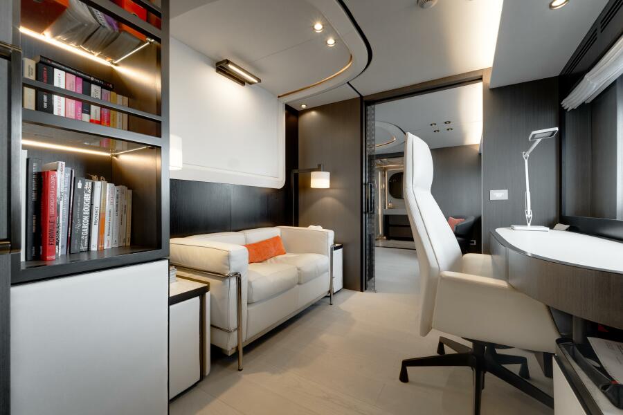 Inside, L.A.U.L exudes contemporary elegance with a soft palette of white, grey, and natural textures. The main saloon offers panoramic views and a seamless transition to a formal dining space for up to twelve guests. Five beautifully appointed staterooms accommodate twelve guests in supreme comfort, including a full-beam master suite on the main deck featuring a private study, walk-in wardrobe, and luxurious marble ensuite.