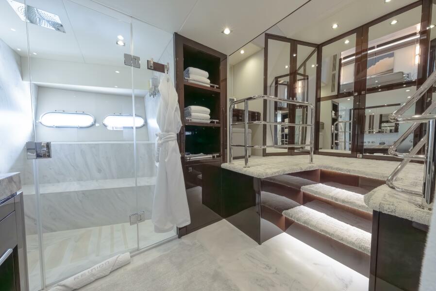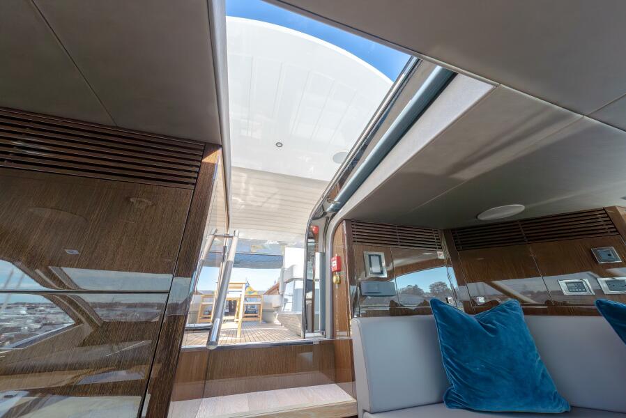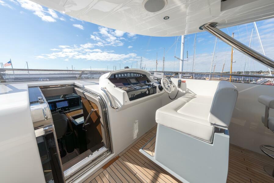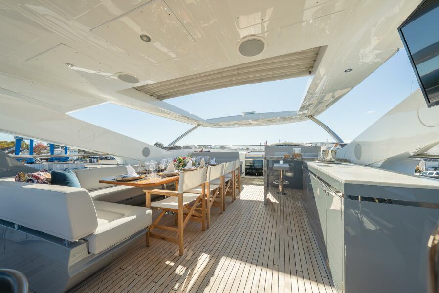 Above deck, the flybridge serves as the yacht's social hub, featuring expansive areas for dining and lounging. A custom wet bar is outfitted with premium amenities, including a refrigerator, ice maker, and grill, ideal for hosting gatherings. Additionally, the aft deck lounge with a coffee table offers a more intimate space for relaxation. The hardtop sunroof and retractable sunshade canopy provide the flexibility to enjoy open skies or cool shade, creating the perfect setting for entertaining or unwinding while taking in sweeping, panoramic views.