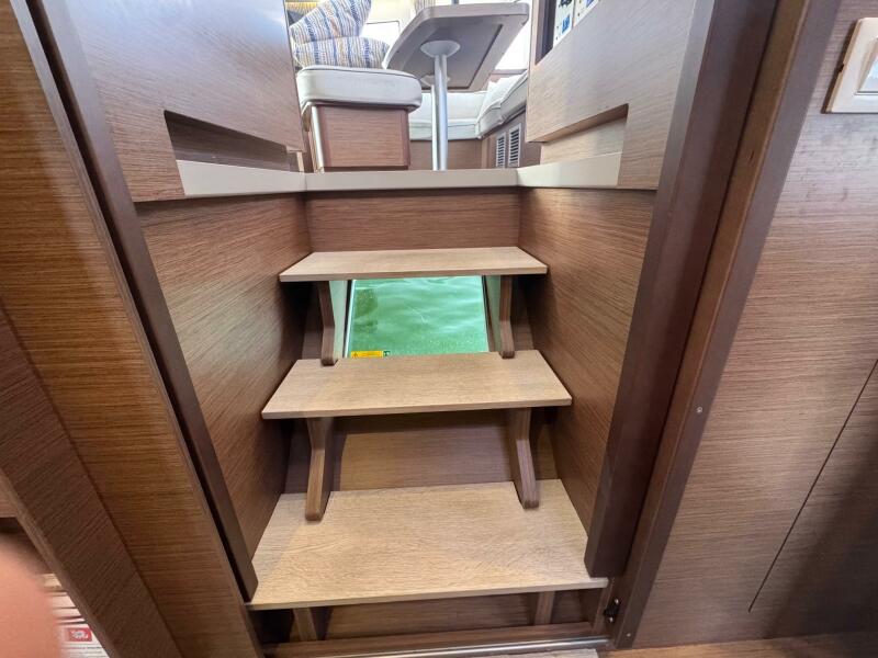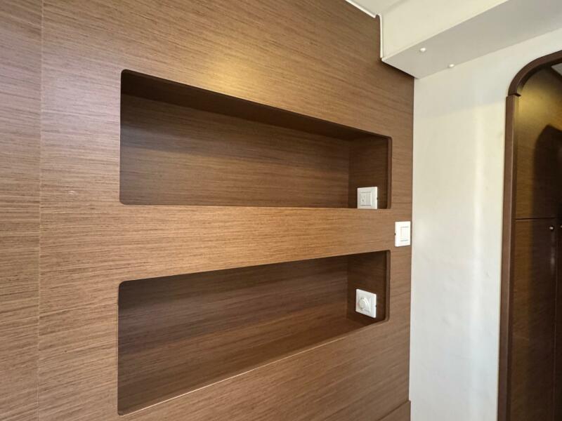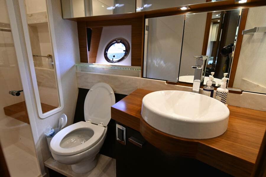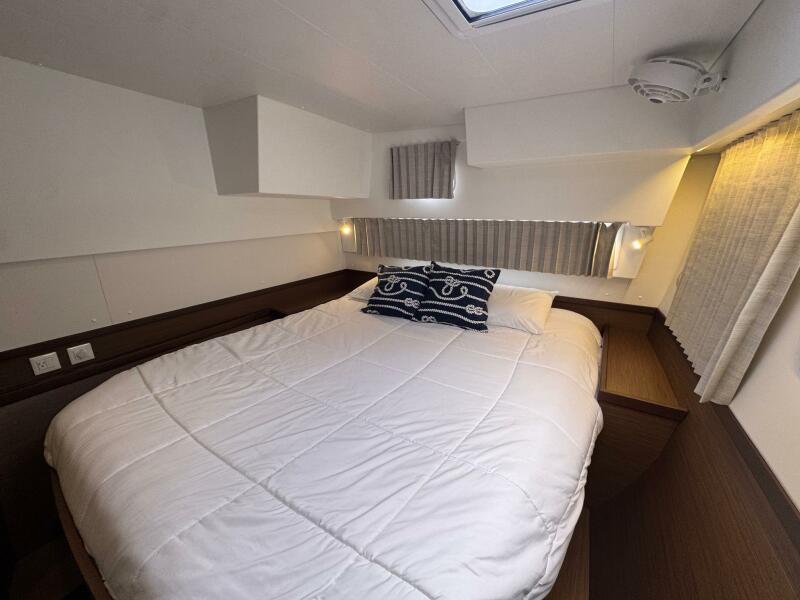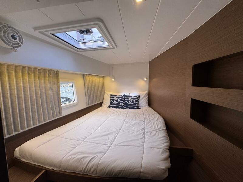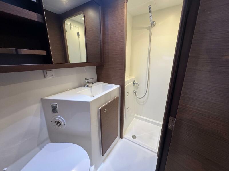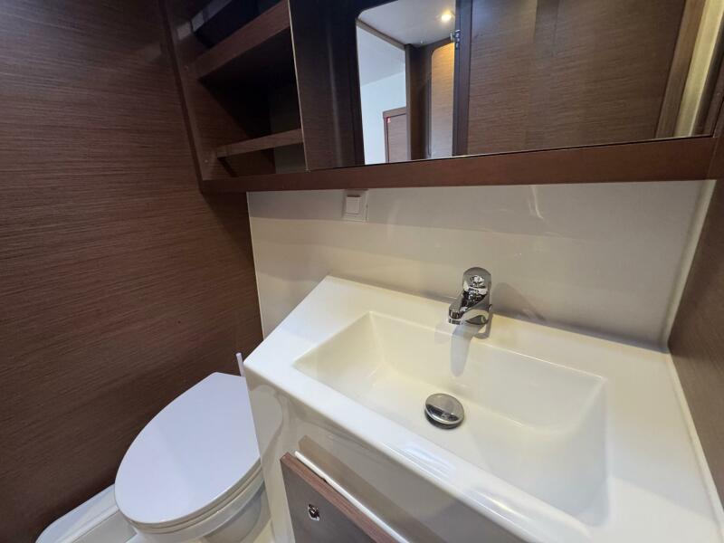 The Owner’s Version configuration dedicates the entire starboard hull to a spacious owner’s suite with an oversized head and separate shower. The port hull features two well-appointed guest cabins, each with its own en-suite head, offering excellent comfort and privacy for family or guests.