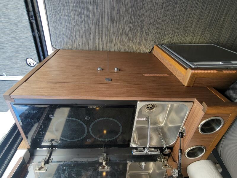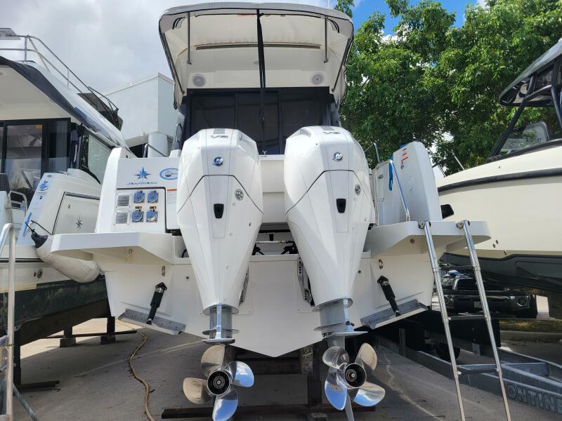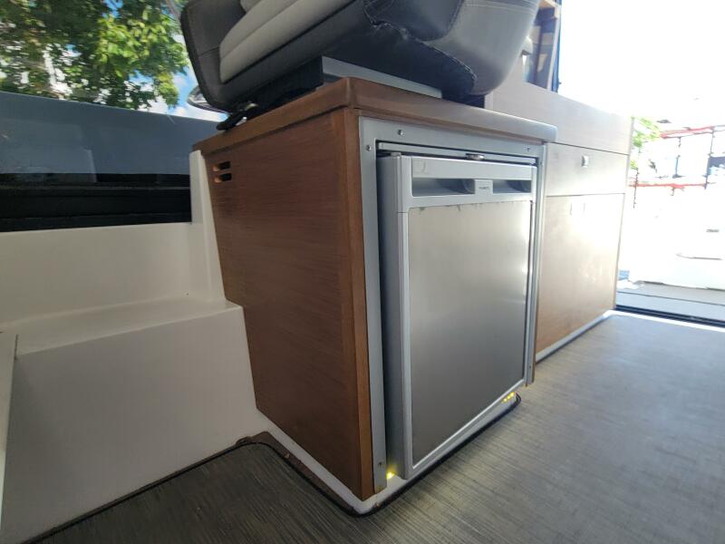 The NC895 is one of the most popular cabin cruisers with twin engines with over 1800 units sold since 2012. Designed with a modern contemporary cabin design, with room for six to sleep for those overnight trips. Large windows for great visibility, a starboard sliding door for easy access and communication with the outside, a generator to keep all systems running in comfort while cruising, a roof rack for paddleboards and other equipment make this cruiser a perfect family cruiser. For sandbar outings the boat is equipped with a removable large sunshade and comfortable sunbathing cushions to lounge at the bow area and an extended canvas bimini top in the cockpit for sun protection when dining al fresco or when converted to lounging.