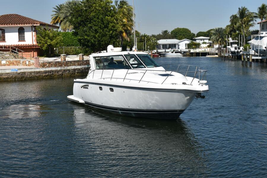 Introducing the stunning 2006 Tiara Yachts 3600 Sovran, a remarkable cruiser that embodies elegance and performance. With an overall length of 41.67 feet, this vessel features a sleek modified Vee hull made of durable fiberglass, ensuring both stability and style on the water. Powered by twin Cummins Diamond Series inboard engines, each delivering an impressive 450 hp, it achieves a cruising speed of 27 mph, making it perfect for exhilarating adventures.
