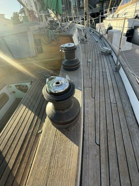 “Sir Edmund” is a 49’ cold molded schooner designed by Chuck Burns and built by Covey Island Boat Works. She was designed to be an ocean racer for an experienced yachtsman and rigged to work efficiently for double handing. The original owner's first yacht of this design, “Sir Isaac,” competed in the 1986 TransPac Ocean Race taking first in her class and first over all. The next year she competed in the Melbourne to Osaka race, a 6,000 mile double handed ocean race, and is still competing competitively today.
