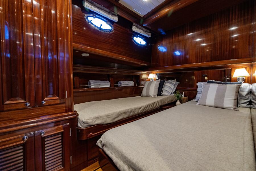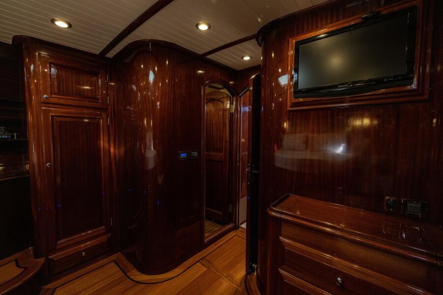 Guest stateroom #2 (VIP) is to port and features two single crisscross berths, a hanging locker, drawer storage, flat screen TV, and a satellite receiver. The master stateroom is all the way forward and features a large queen size bed, port and starboard hanging locker, a vanity, abundant drawer storage and an en-suite head with a large stall shower.