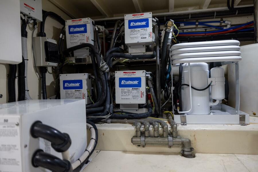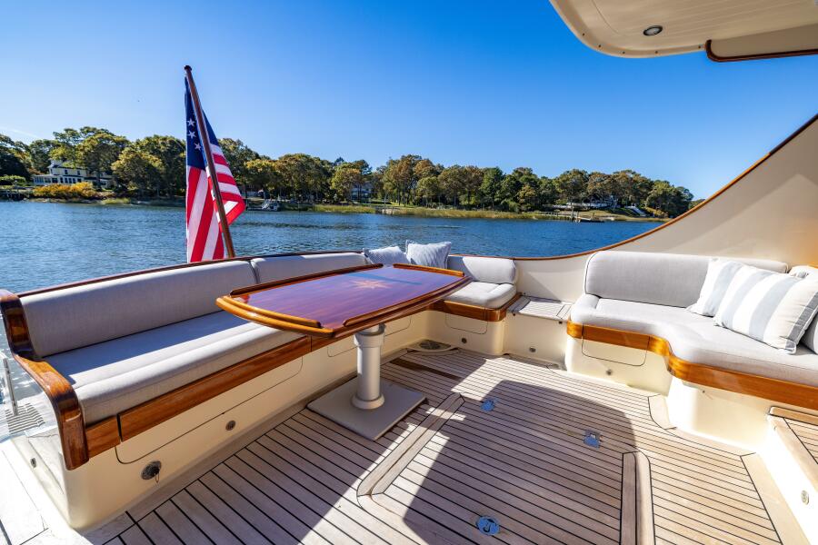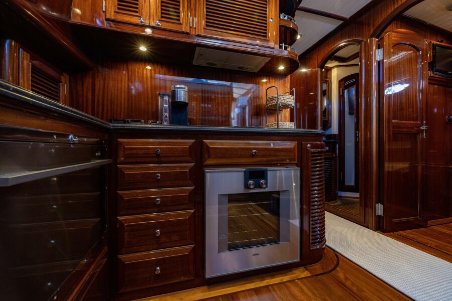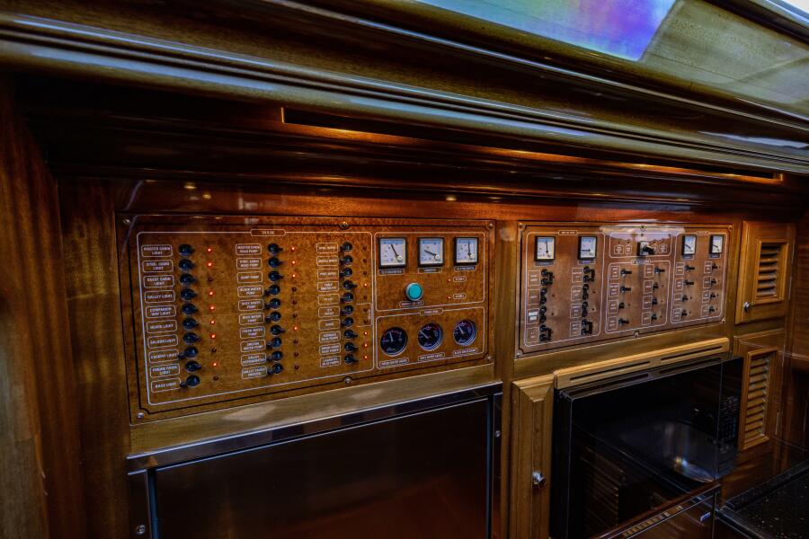 This Vicem features the most popular 3 stateroom layout with the galley down providing you with a huge salon and generous accommodations. As you enter through the double, varnished, Mahogany salon doors, you immediately feel the rich Mahogany woodwork and craftsmanship Vicem is famous for. There are two beautiful sofa's port and starboard, a high-glossed Bensenzoni Mahogany high/low table, stereo system, bottle storage, Uline icemaker, and storage everywhere. There is a chart table and working desk to port and the helm is forward to starboard. Just four steps down is the galley which has beautiful raised Mahogany and louvered panel doors and drawer storage.