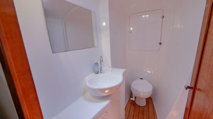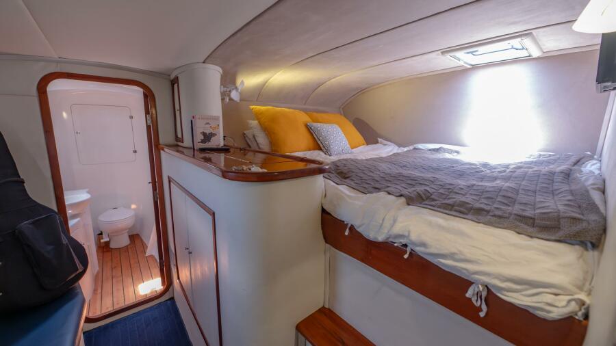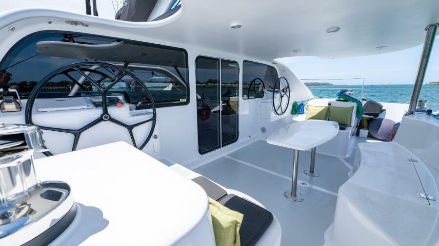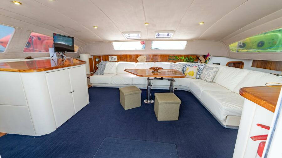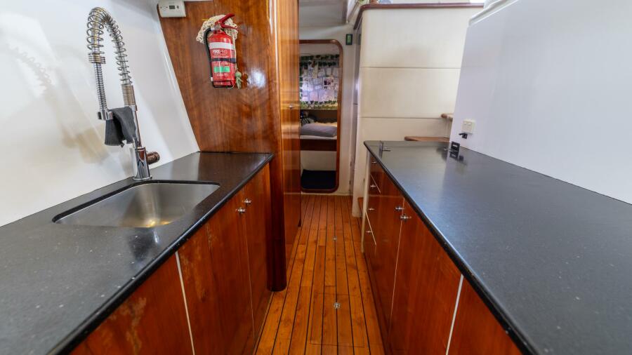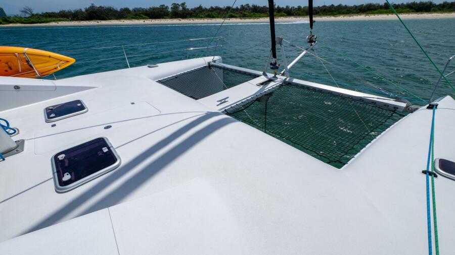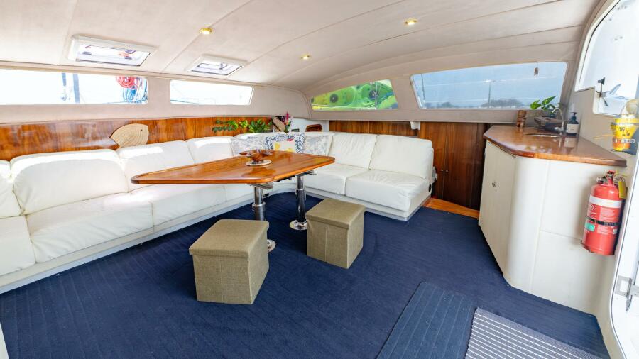 Designed for extended cruising, Safiri features a spacious saloon and four generous cabins including two king berths and two doubles. Headroom is 1.95 metres in the saloon and up to 2.0 metres in the hulls. The galley, located in the starboard hull, is equipped with new Isotherm refrigeration and freezer (2025), a three-burner gas stove with oven, stainless-steel sink and gas alarm. Two bathrooms with electric freshwater Vacuflush toilets, a 160-litre hot-water system and 1,500-litre water capacity ensure comfort for long-term cruising
