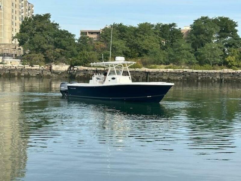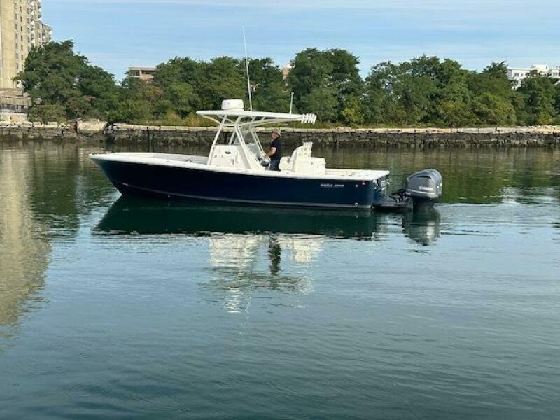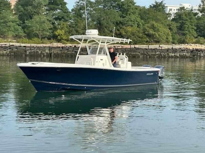 RESOLUTE, is a great example of a well equipped 31 Regulator FS, featuring the Flag Blue Hull, full Garmin Package, Powder Coat Package, Cockpit Engine Flush, Sun Bed Table, New Forward Cushions, and more.