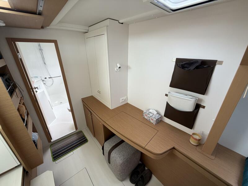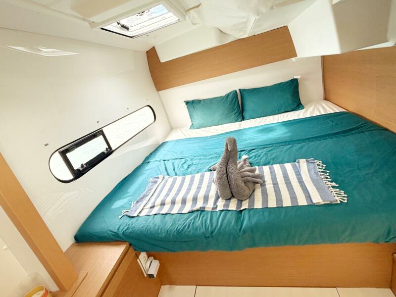 The Excess 11 features dual helm stations aft on each hull, providing excellent sail visibility and a direct connection with the cockpit and crew while keeping the main living area open and spacious. Steering via Dyneema cables ensures a responsive and direct feel. The interior is remarkably bright for her size, with large hull windows and a three-cabin layout dedicated to comfort. The starboard hull houses a luxurious master suite with a generous 2m x 2m bed, while the port aft cabin offers an equally impressive berth.