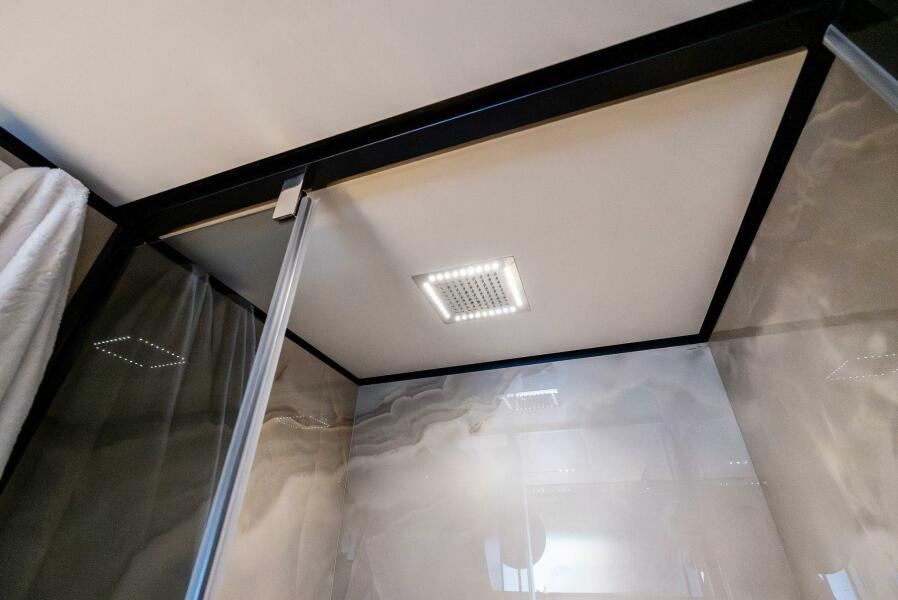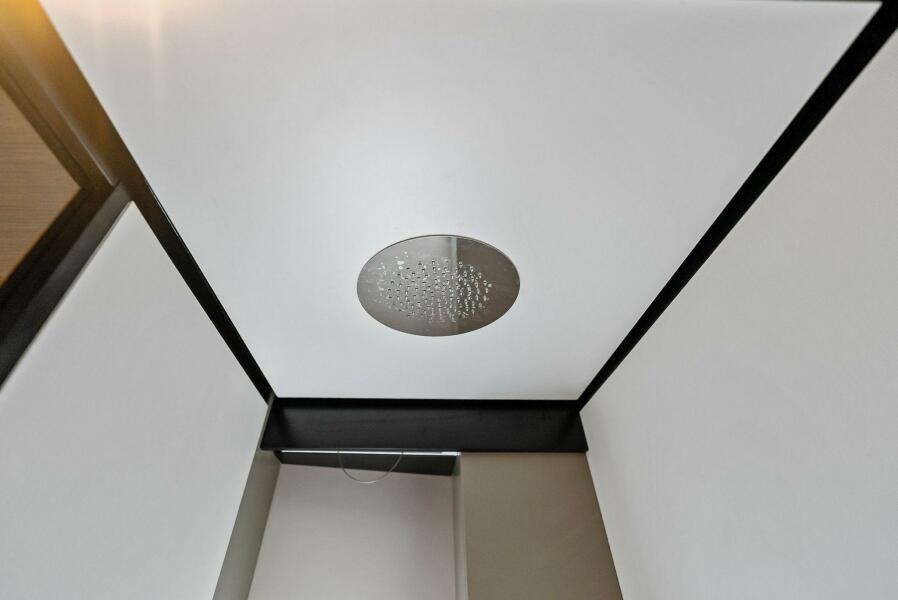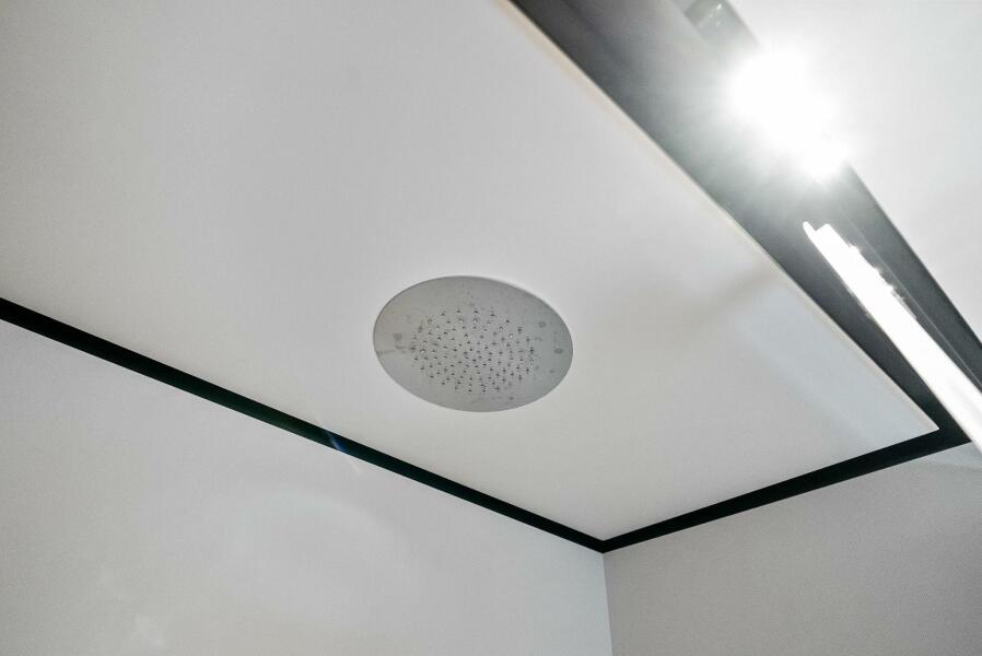 The minimalist yet detailed design provides a continual counterpoint to the walk-in wardrobe and the grand bathroom, where the smoked-glass inserts and functionality of form are in tune with current trends. The winning style of this desirable new model is based on a blend of contrasting textures. The striped ceiling, the ribbed surface of the walls, the grid-pattern headboards and the lounge furniture’s oblique-stripe motif play off one another in a profound natural harmony.