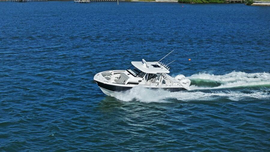Below, the cabin offers a practical and comfortable space with a convertible berth and enclosed head—ideal for quick breaks or overnight stays. With low hours, fresh service, and well-rounded features, this S 358 is a clean, turnkey option for anyone looking for a capable, modern center console.