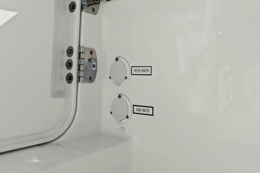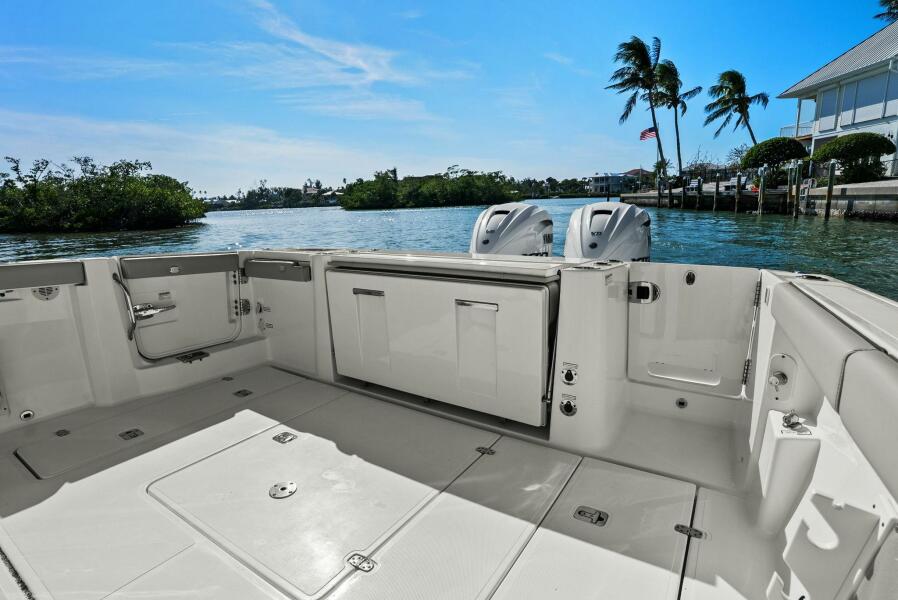 Equipped with a full Garmin electronics package, the helm is easy to operate and provides clear, reliable information whether you’re fishing offshore or cruising with family. The layout is designed to handle both activities comfortably, offering ample cockpit space for anglers while still providing plenty of seating and thoughtful amenities for guests.