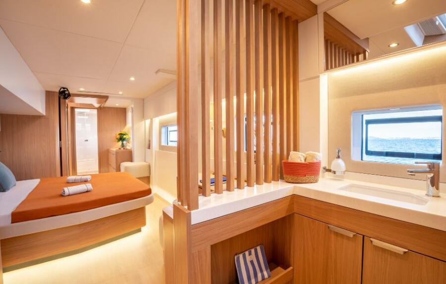 Every detail of the BALI 5.8 reflects the expertise and the audacity of the brand. Thanks to its owner's master suite worthy of a palace, spaces and storage to the expectations of a demanding clientele, a bathroom entirely redesigned in a XXXL version, to the size of the boat, it proposes a unique experience at sea. Designed for comfort, intimacy and always more space, the owner’s master suite with integrated bathroom and separate toilets rivals the highest hotel standards. For each configuration (4,5 or 6 cabins), each guest cabin has its own separate bathroom.