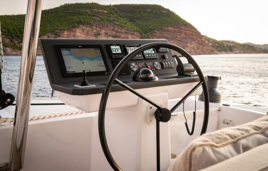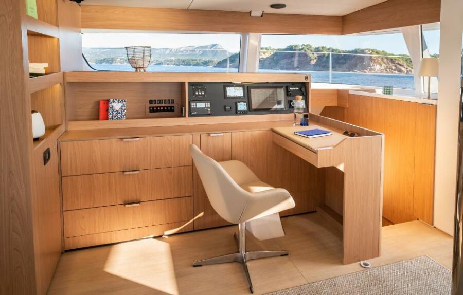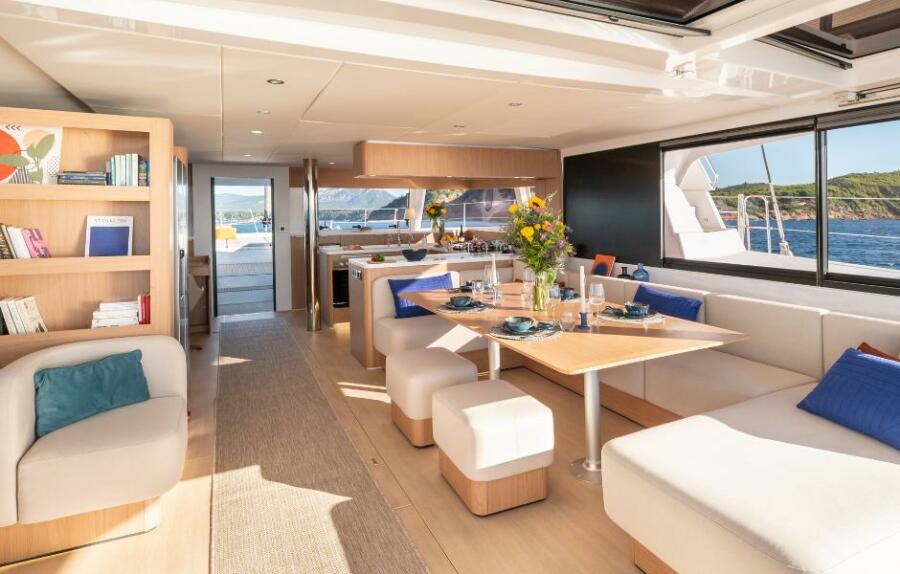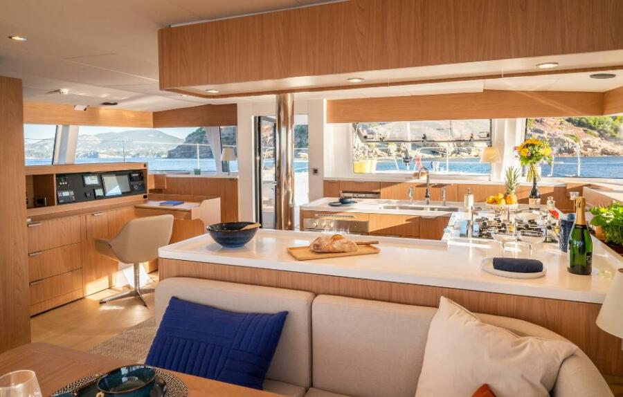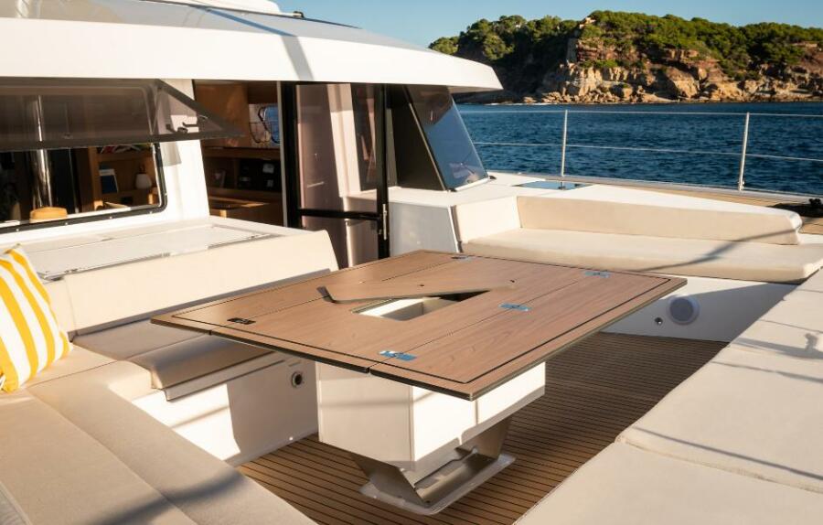 The BALI 5.8 offers a sumptuous connection to the sea. The cockpit-square, thanks to its swing-tilt rear door, creates a unique living space, vast, where the layout and design are fully expressed. The sunbathing area, along with the comfort, dining, and lounge zones, is unmatched. With outstanding natural light, the large windows provide natural ventilation and an exceptional panoramic view. The large opening kitchen window allows communication with the front cockpit. A totally open space with a panoramic sea view.