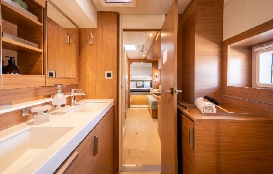 - Versatile Accommodations: Choose between a 3-cabin/3-bath owner’s version with a luxurious port-side suite, complete with a settee, desk, and separate shower, or a 4-cabin/4-bath layout ideal for charter or large groups. The “Jack & Jill” bathroom option maximizes space and comfort.